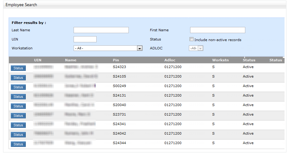 Employee List The ‘Employee List’ tab displays a searchable list of employees grouped by ADLOC for which an Administrator has access.