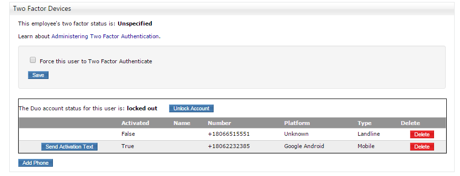 Add Phone – Clicking this button will open a new window that allows an administrator to add a landline phone number to an employee’s Duo account.