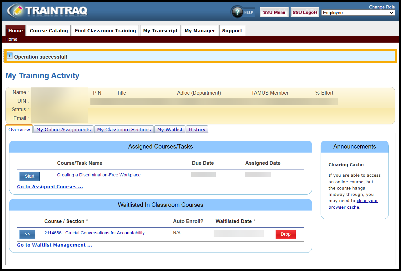 - A message displays at the top of the page to confirm that you have now been removed from the waitlist. Note: Refresh the page to see the course removed from the Waitlisted in Classroom Courses section.
