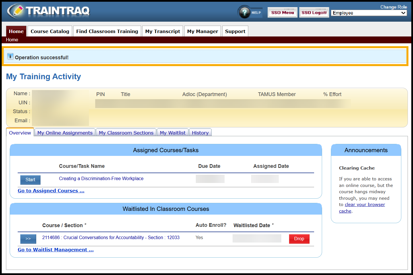 - A message displays at the top of the page to confirm that the training has been dropped. Note: You can refresh your page to see the section is removed from the Waitlisted In Classroom Courses section.