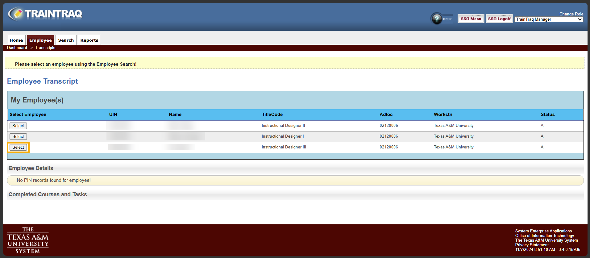 - Find the employee whose transcript you would like to view in the list of your employees and click the Select button located to the left of the employee’s UIN.