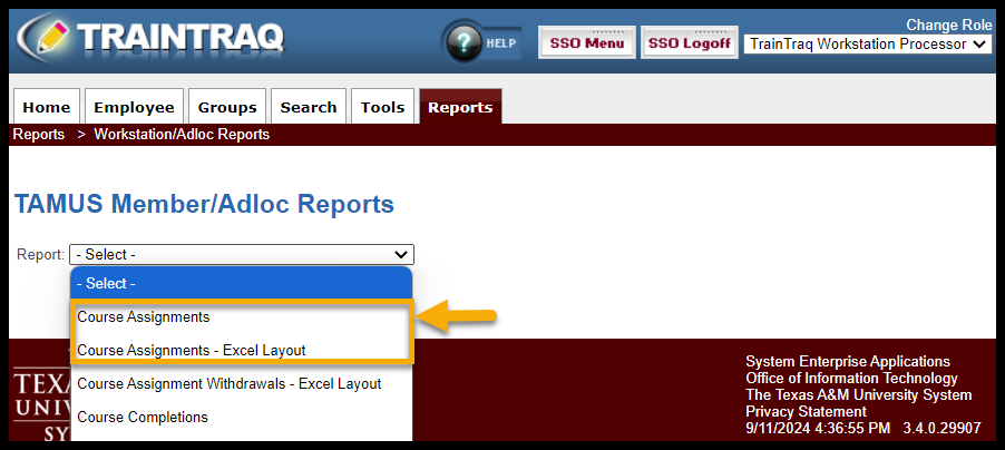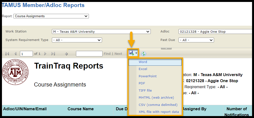 - The TAMUS Member/Adloc Reports page displays. Select the Course Assignments —OR— Course Assignments – Excel Layout option in the Report field drop-down menu.