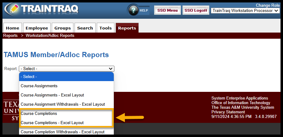 - The TAMUS Member/Adloc Reports page displays. Select the Course Completions —OR— Course Completions – Excel Layout option in the Report field drop-down menu.