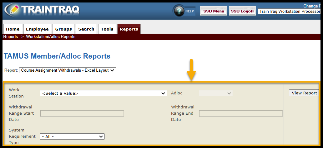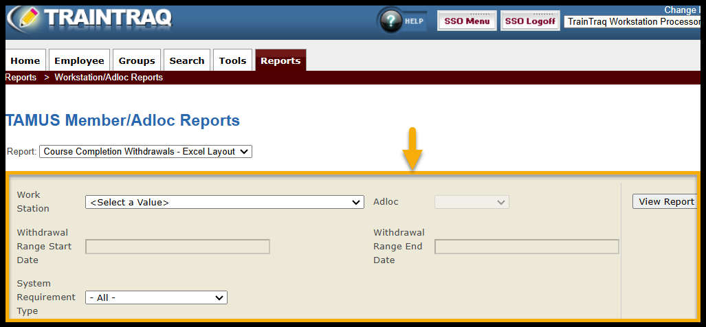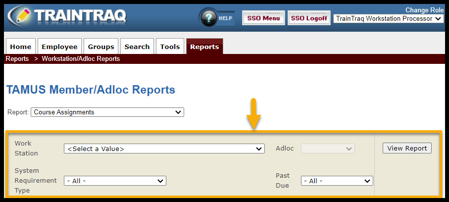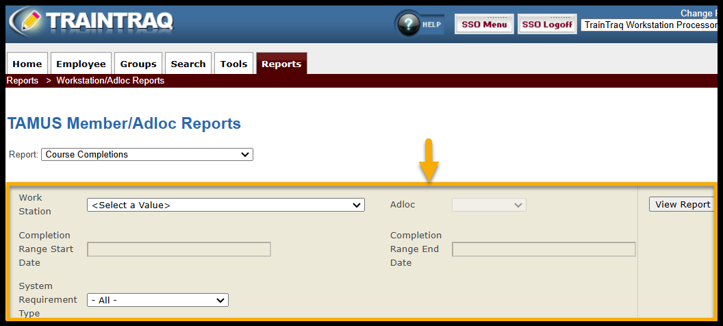 - Once all selections have been made, click the View Report button on the right side of the report parameters section. TrainTraq assembles the report based on the chosen parameters and displays the results at the bottom of the page.