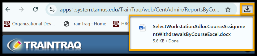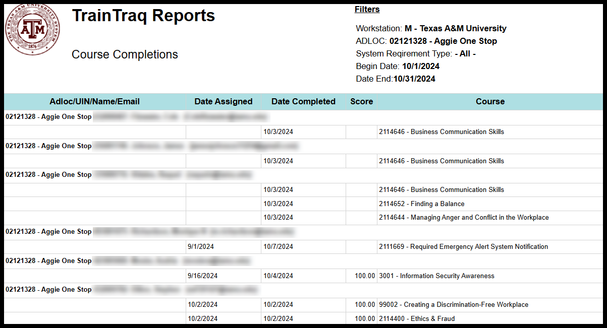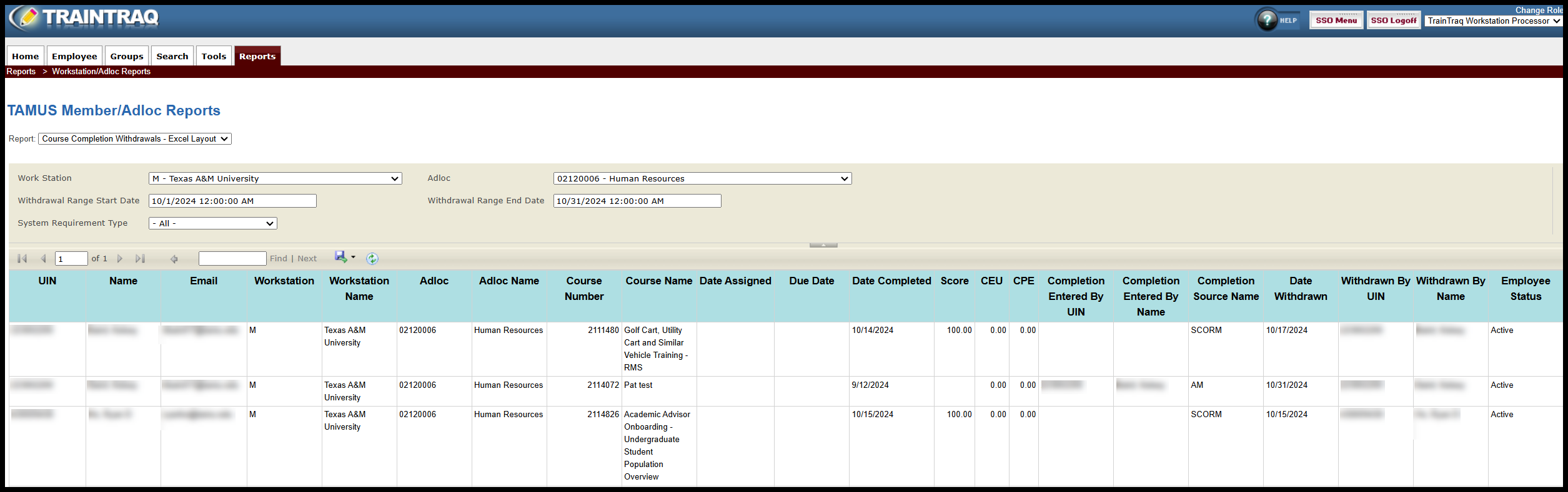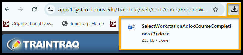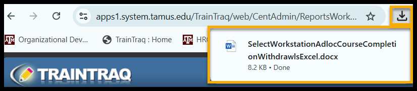 Caution: If you pull a large report—such as completions for a course that many people have taken or completions over a wide date range—you may receive an error message. If this happens, either change your filters to pull less data, use a tool such as BusinessObjects to generate a report, or request a report through TrainTraqHelp@tamus.edu.