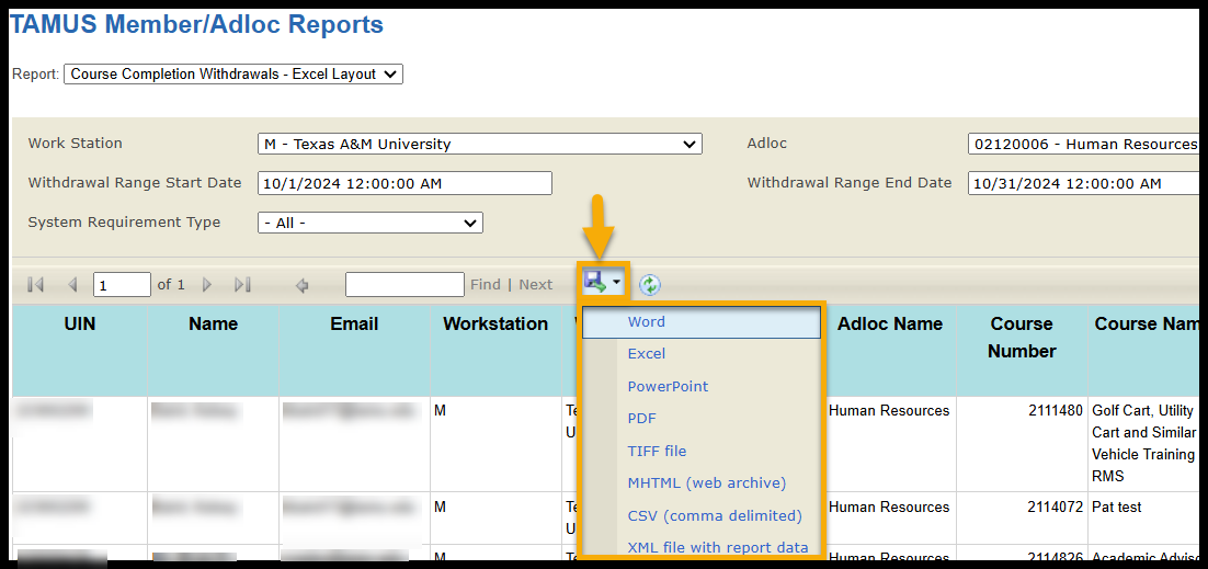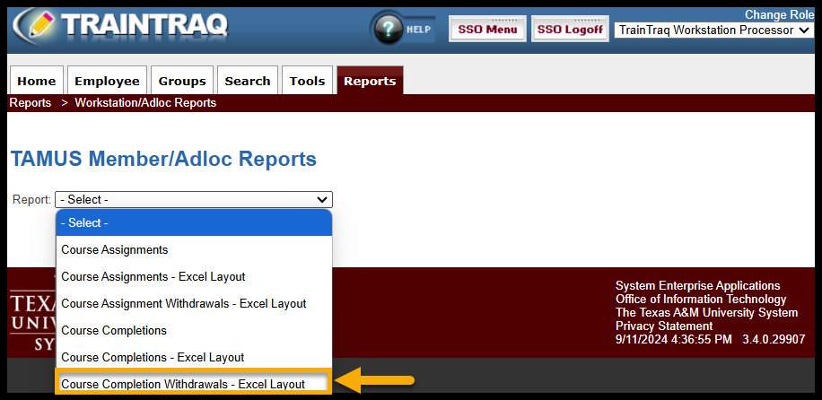 - The TAMUS Member/Adloc Reports page displays. Select the Course Completion Withdrawals – Excel Layout option in the Report field drop-down menu.