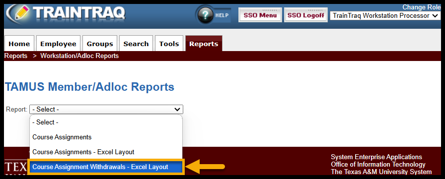 - The TAMUS Member/Adloc Reports page displays. Select the Course Assignment Withdrawals – Excel Layout option in the Report field drop-down menu.