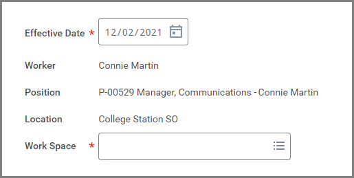 Note: If a different Work Space needs to be assigned to a Worker’s other position(s), switch to the Worker’s additional job(s) and use this same task to update the Work Space for that position.