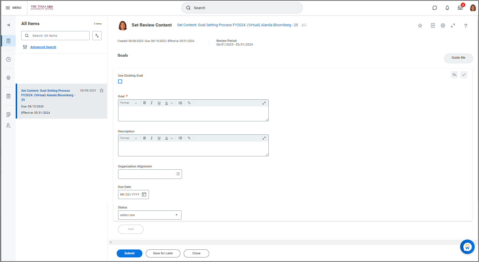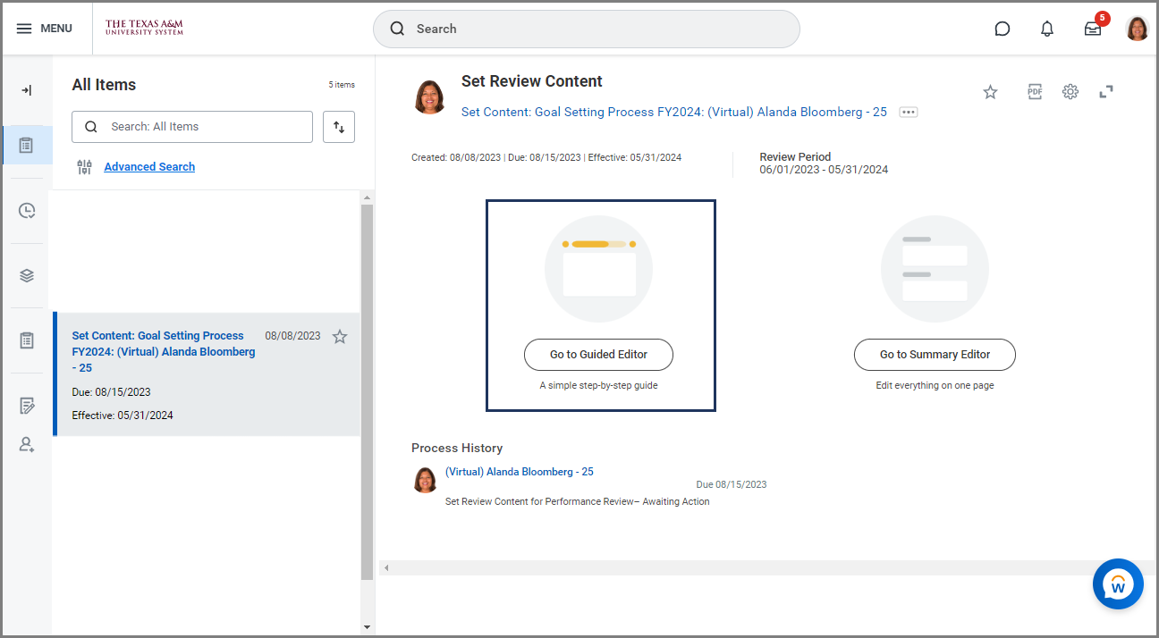 - Select the Set Content: Goal Setting Process: Employee Name inbox task.