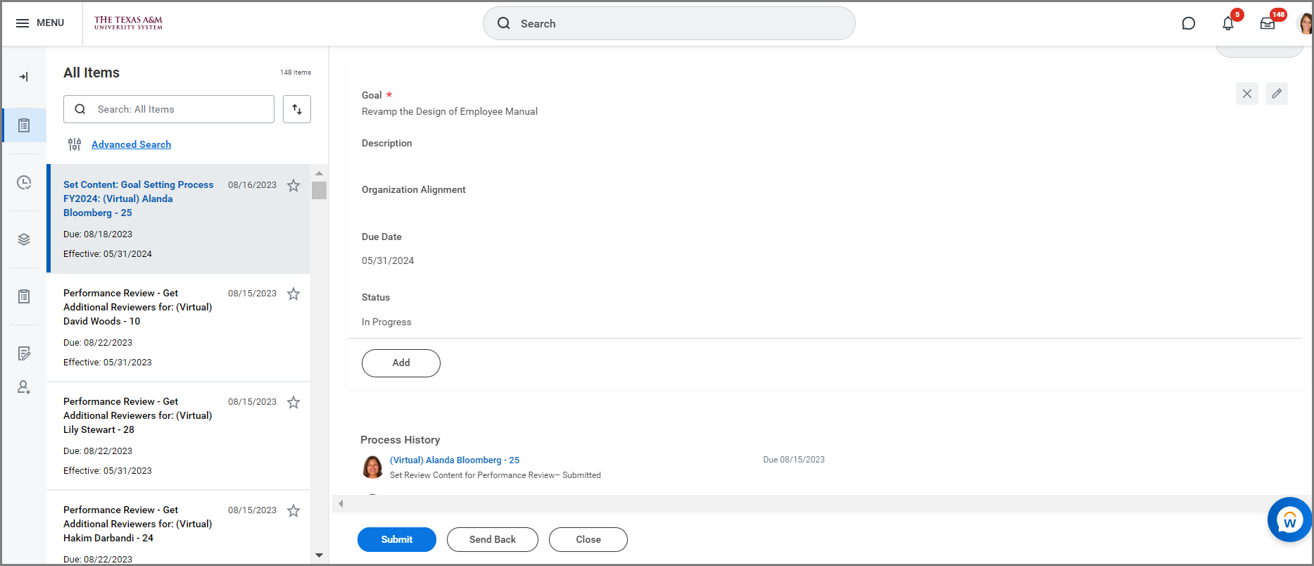IMPORTANT: If you need to make changes to goals, the best practice is to Send Back to the Employee and communicate those changes. If you make changes to the goals directly as the manager, the new goal will not be routed to the Employee for review.