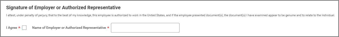 - Select the I Agree checkbox and enter your name in the Name of Employer or Authorized Representative field.