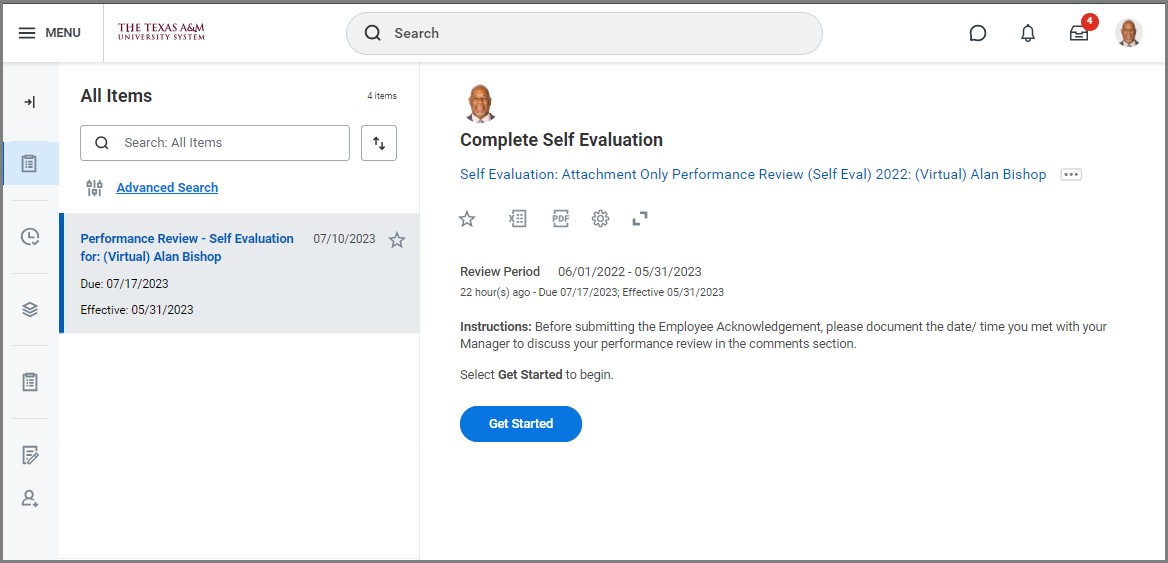Navigate to your Inbox and read the directions provided for the Performance Review Self-Evaluation Task and select Get Started to begin.