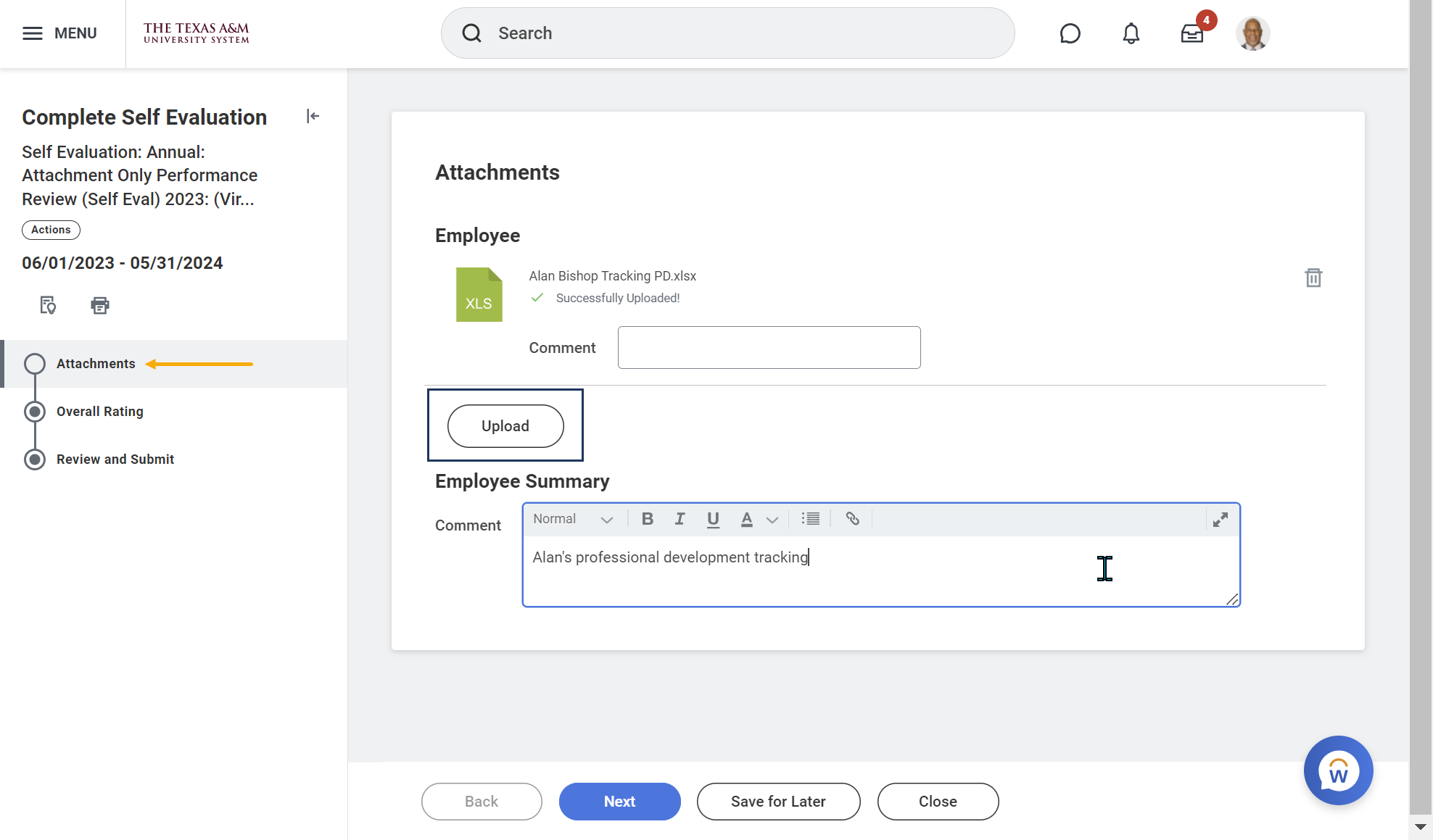 You will upload the self-evaluation you completed into Workday as an attachment (if applicable).