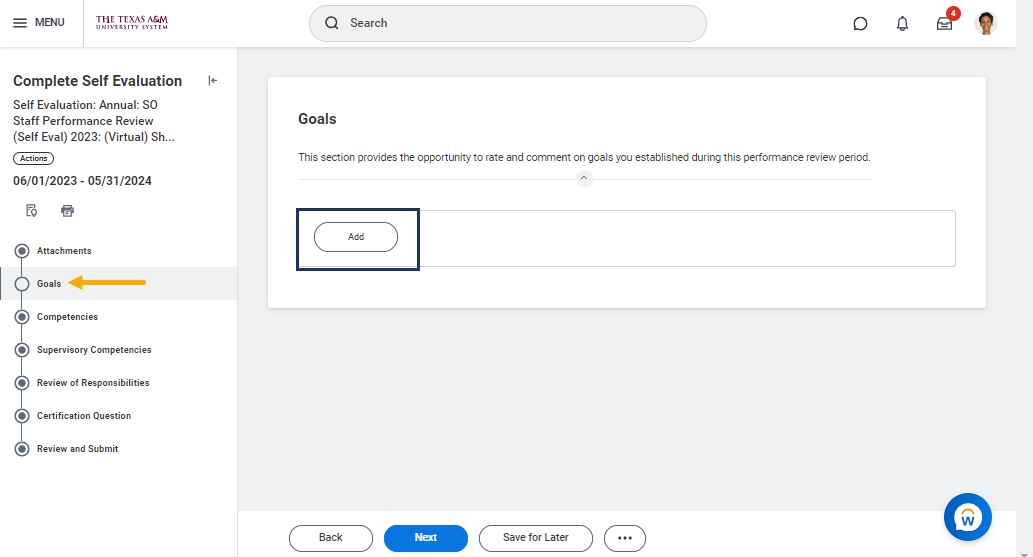 Not all departments use the goals feature. Select Next to move to the next section, if goals are not relevant for your performance review.