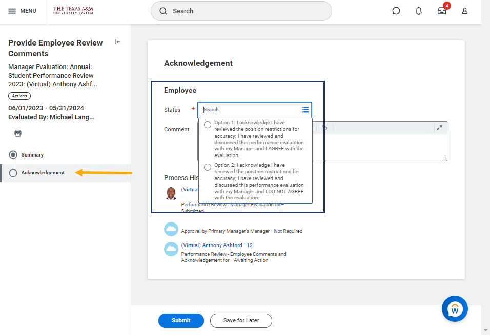 - Enter Comments as needed including the date and time you met with your manager to discuss the performance review and select Submit.