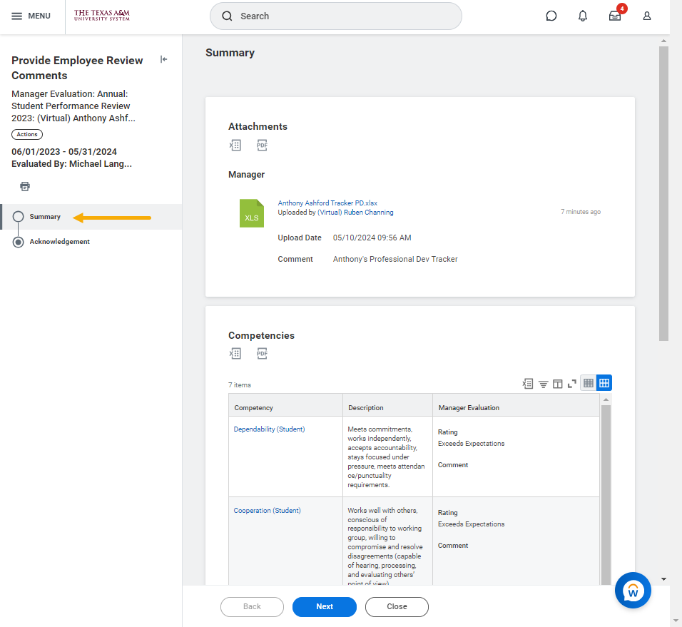 - You can review all information provided by you in your self-evaluation (if applicable), your Manager and any Additional Reviewers or Additional Managers that were added to the review. Your overall rating will also be visible and select Next.