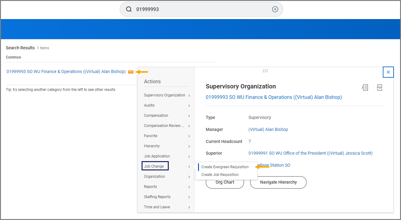 - Navigate to the Supervisory Organization where you need to create an evergreen requisition.