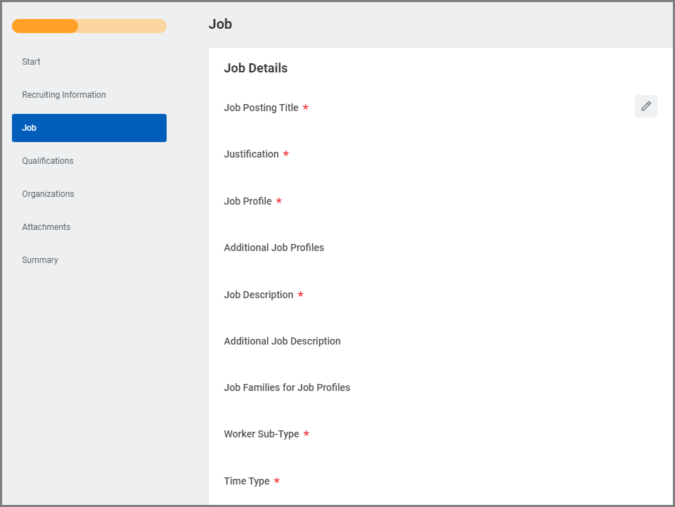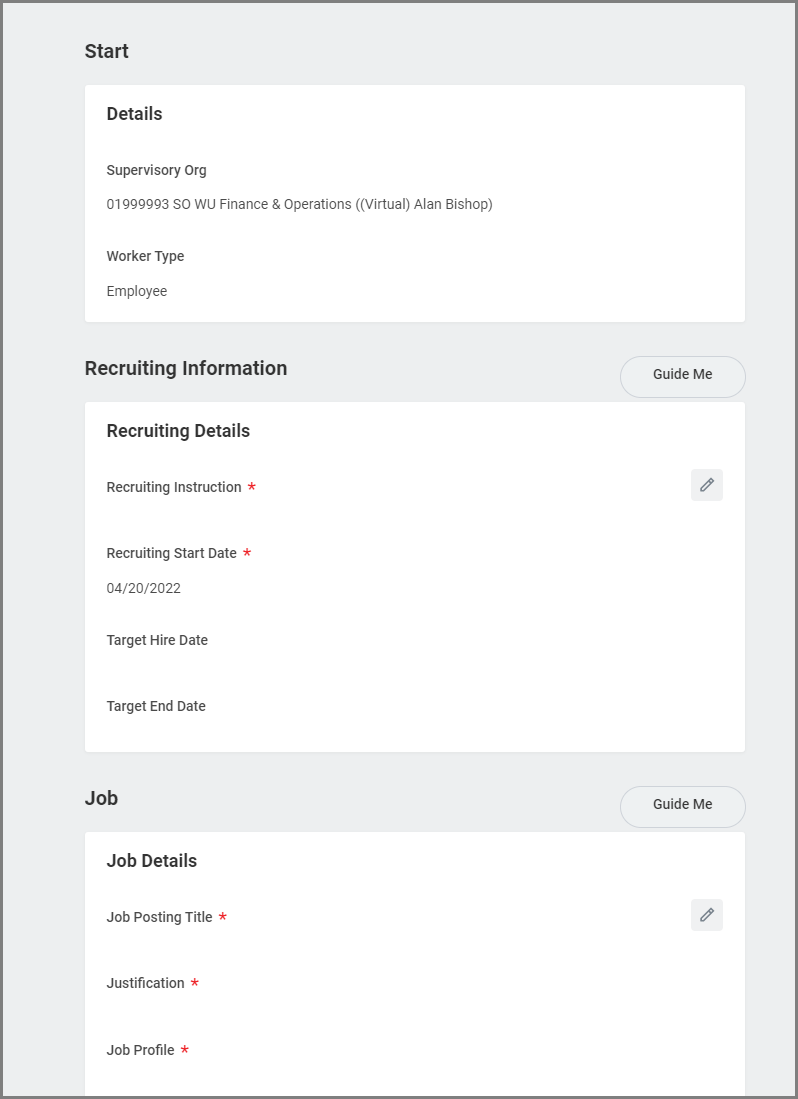 - In the Job section, add or edit the following fields as needed: Job Posting Title, Justification, Job Profile, Job Descriptions, Worker Sub-Type, Time Type, Primary Location, Primary Job Posting Location, and Scheduled Weekly Hours.