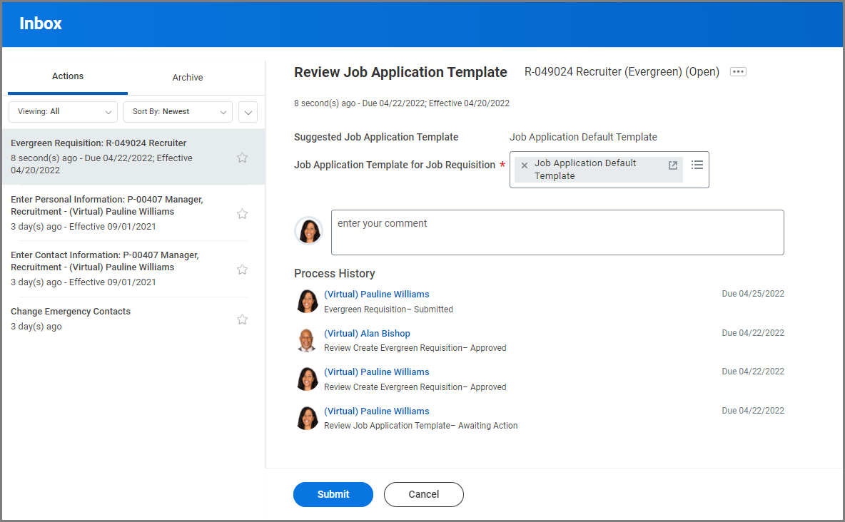 The business process then routes to the Hiring Manager for approval. The business process will route to the Recruiting Partner for review/approval once approved by the hiring manager.