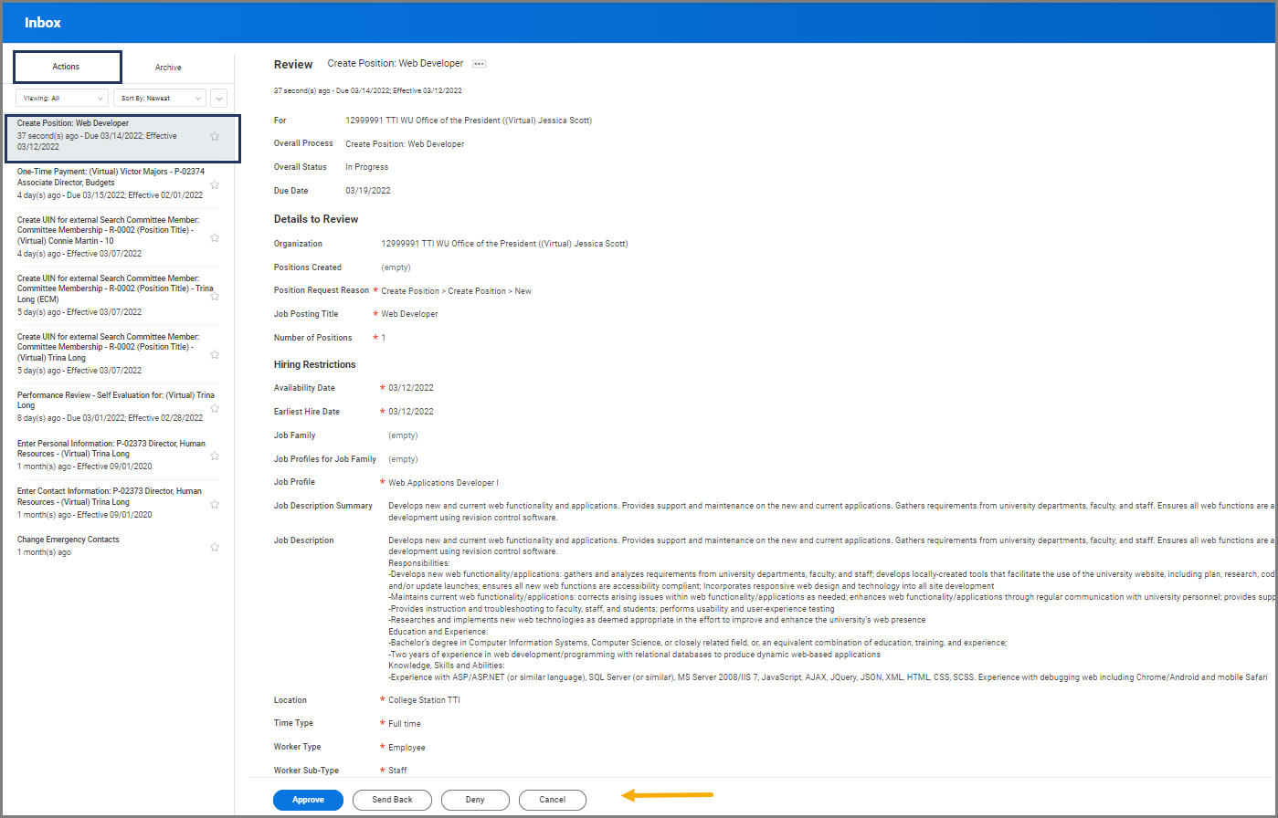 - Review all the details about the position and select Approve, Send Back or Deny.