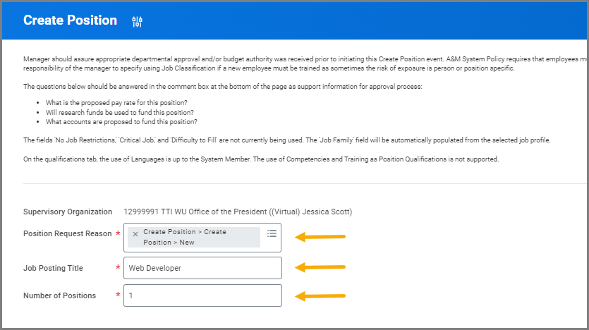 The employing Supervisory Organization is responsible for ensuring appropriate approvals and budget authority prior to initiating any Create Position event (including any additional approvals required beyond what is configured in Workday).