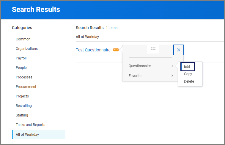 - Access your questionnaire by searching for it and selecting Actions > Questionnaire > Edit.