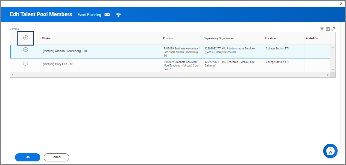 - Select the Plus Sign button to add Talent Pool members by searching for their names or UINs.
