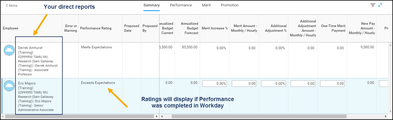 - You are now ready to complete the merit task for these employees. Follow the steps beginning at Step 1 outlined in the previous section Performance Ratings Already Populated in Workday.