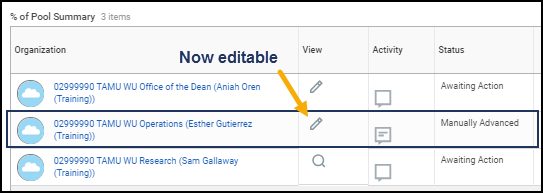 - The Supervisory Organization is now available for you to propose merit on behalf of the Manager of that Supervisory Organization. “Manually Advanced” will appear under the Status column.