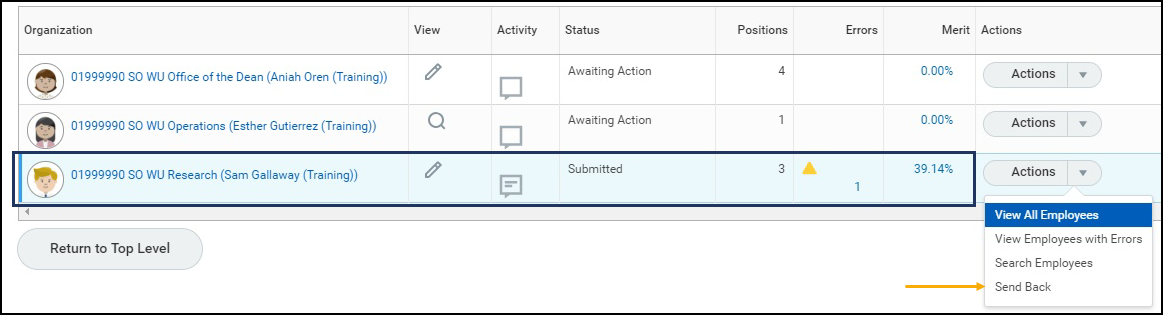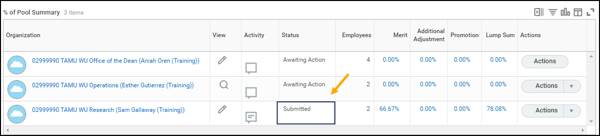 - You will not be able to submit your task until all Supervisory Organizations below you appear as “Submitted” or “Manually Advanced.” This means you cannot submit your merit task if any Supervisory Organizations appear as “Awaiting Action.”