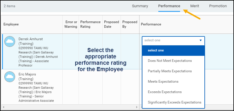 - Select the Performance tab in the merit grid and select the appropriate rating in the Performance Rating field as shown below.