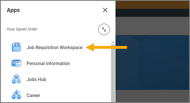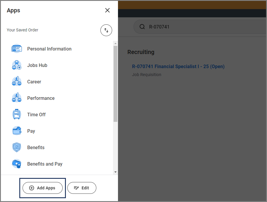 - Ensure that you have the Job Requisition Workspace App added into your Dashboard. To do so, from anywhere in Workday select Menu > Add Apps.