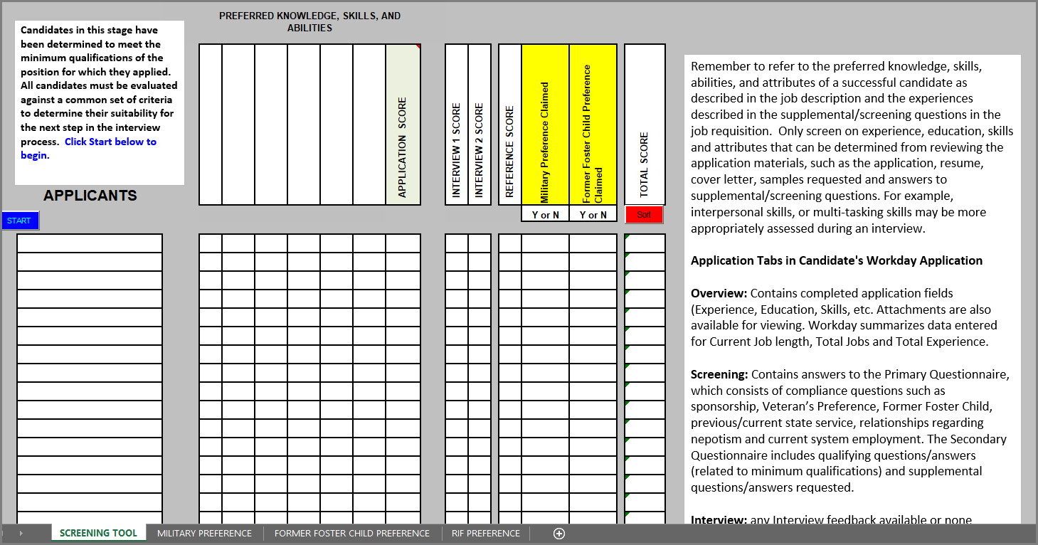 Download the Screening Matrix and follow the directions to add the specific preferred experience/skills that will focus on the candidates to be interviewed.