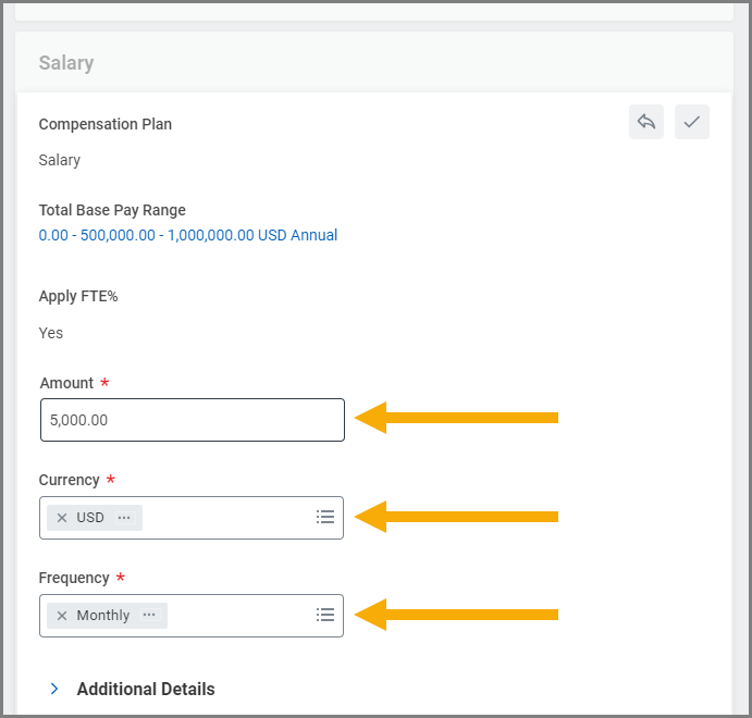 - Frequency (Monthly or Hourly). If the role is non-exempt, the frequency will be hourly. If the role is exempt, the frequency will be monthly. Information can be found at Titles and Salaries. For a salary amount, the section will default to an annual frequency and this needs to be updated to be monthly including the amount.