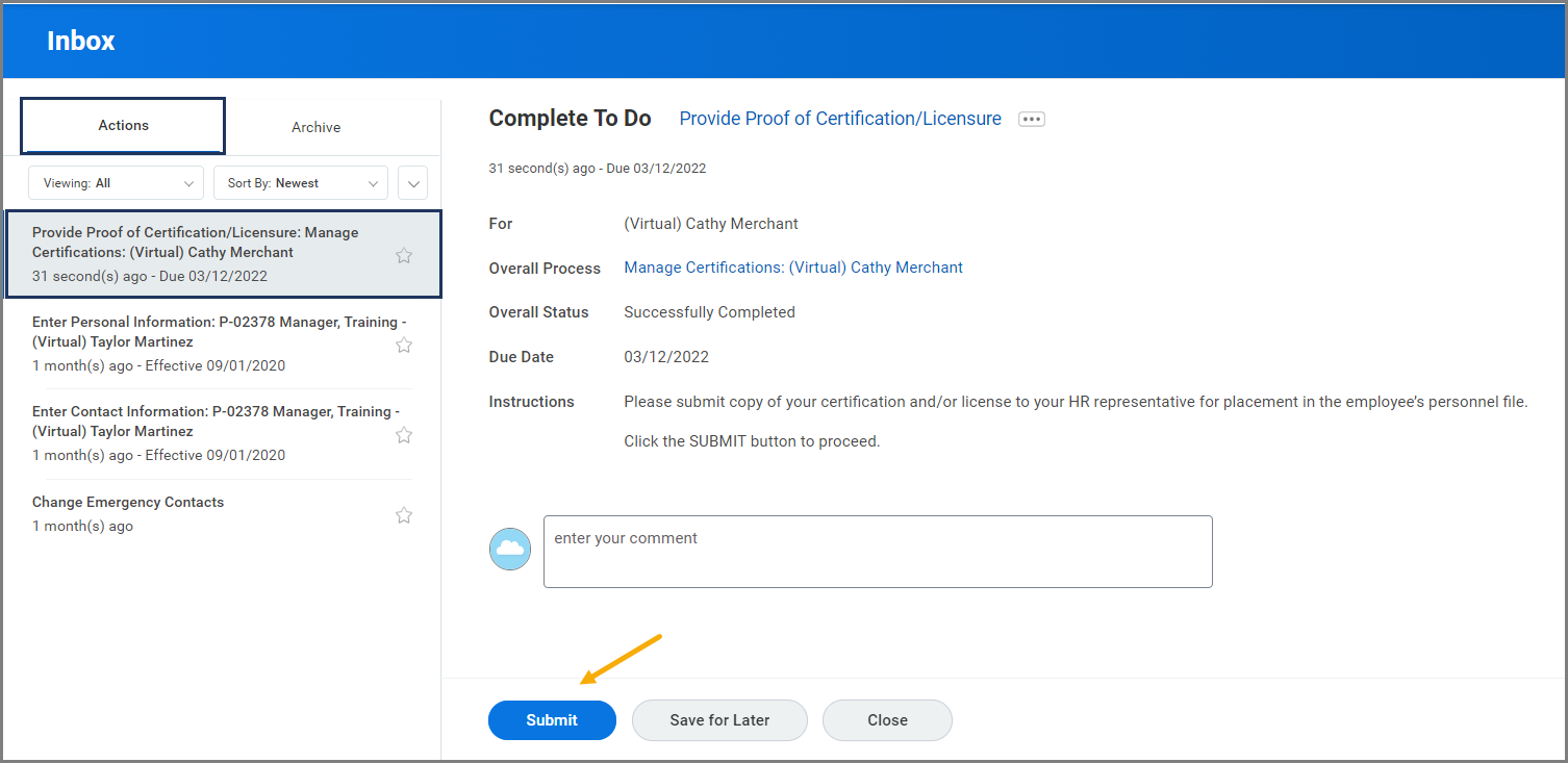 The business process will route to the Manager for approval. Navigate to the Up Next tab for the next steps in the process.