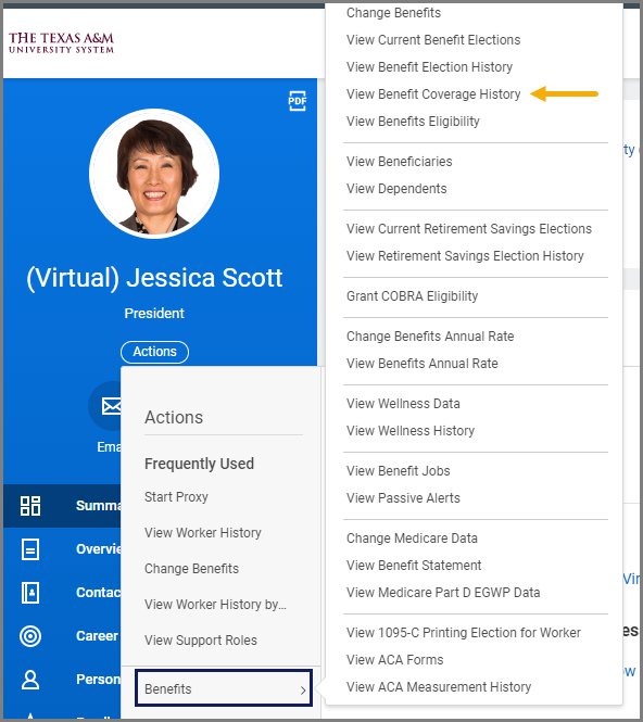 - Navigate to the Employee’s Worker Profile. Select Actions > Benefits > View Benefits Coverage.
