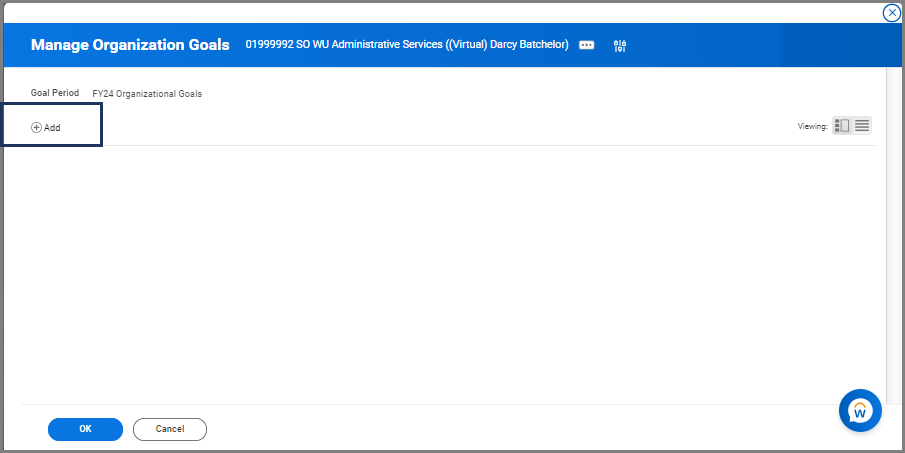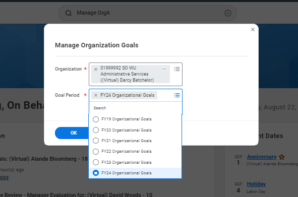 - Search for the Manage Organization Goals task in the Search Bar and select it.