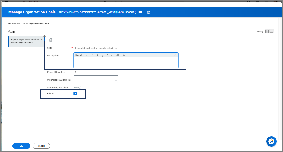 Important: Remember to check the Private checkbox. Doing so allows organizational goals to be visible only to members of the organization chain. If left unchecked, active employees outside your organization chain can view the goals you created which may cause confusion.