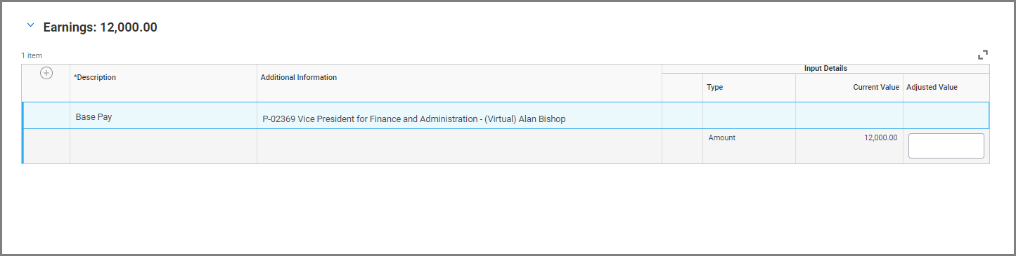 - To model an increase in pay, enter the new amount you would like to use in the Adjusted Value field. In this example, the employee currently receives 12,000 gross pay. To see an increase of $500 in salary, we will enter 12500.