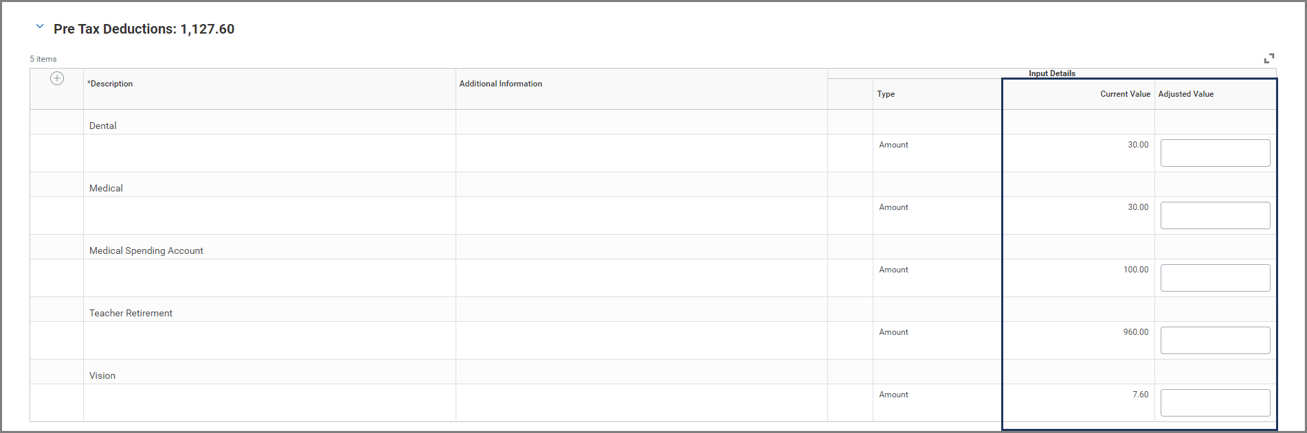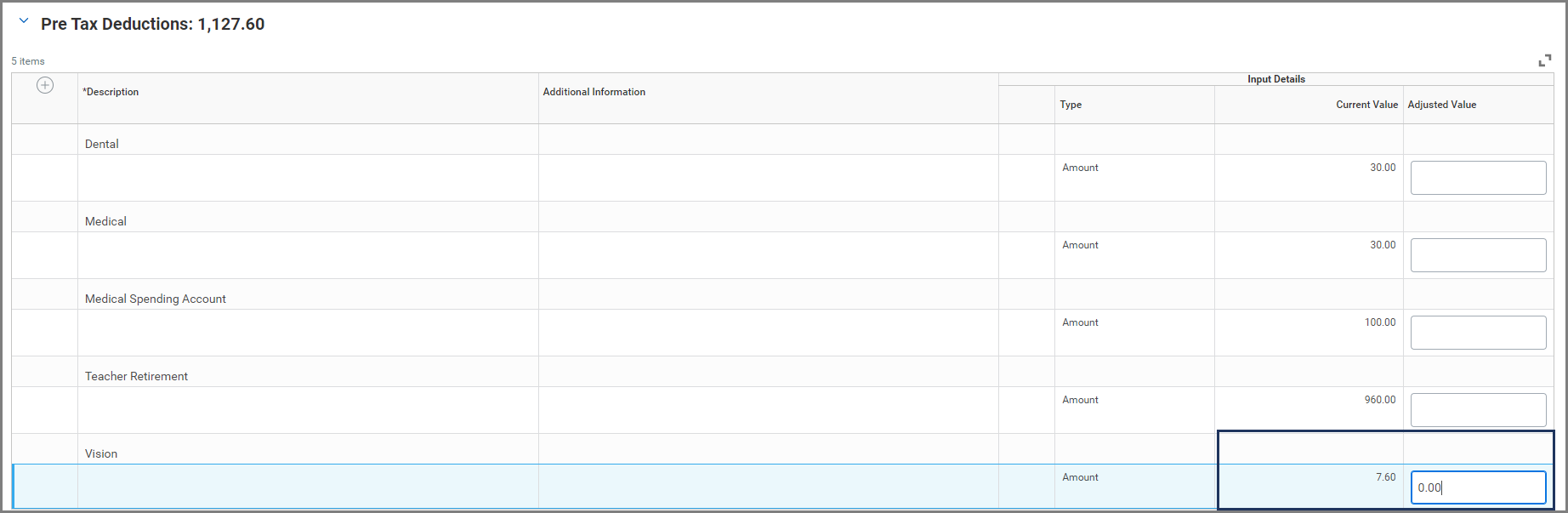 To model a Pre Tax Deduction removal, enter 0.00 in the Adjusted Value field. In this example, the employee currently pays 7.60 for vision insurance . To model the removal of Vision insurance, we will enter 0.00.