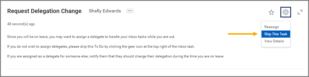 If the Employee has security roles other than Employee as Self (e.g. Manager, Timekeeper), they will receive the Action Item: Request Delegation Change to manage delegations for business processes while on leave.