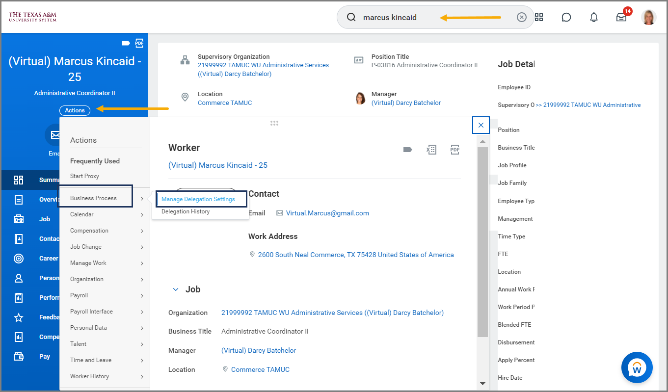 - Navigate to the Employee’s Worker Profile. Using the Action button, select Business Process > Manage Delegations