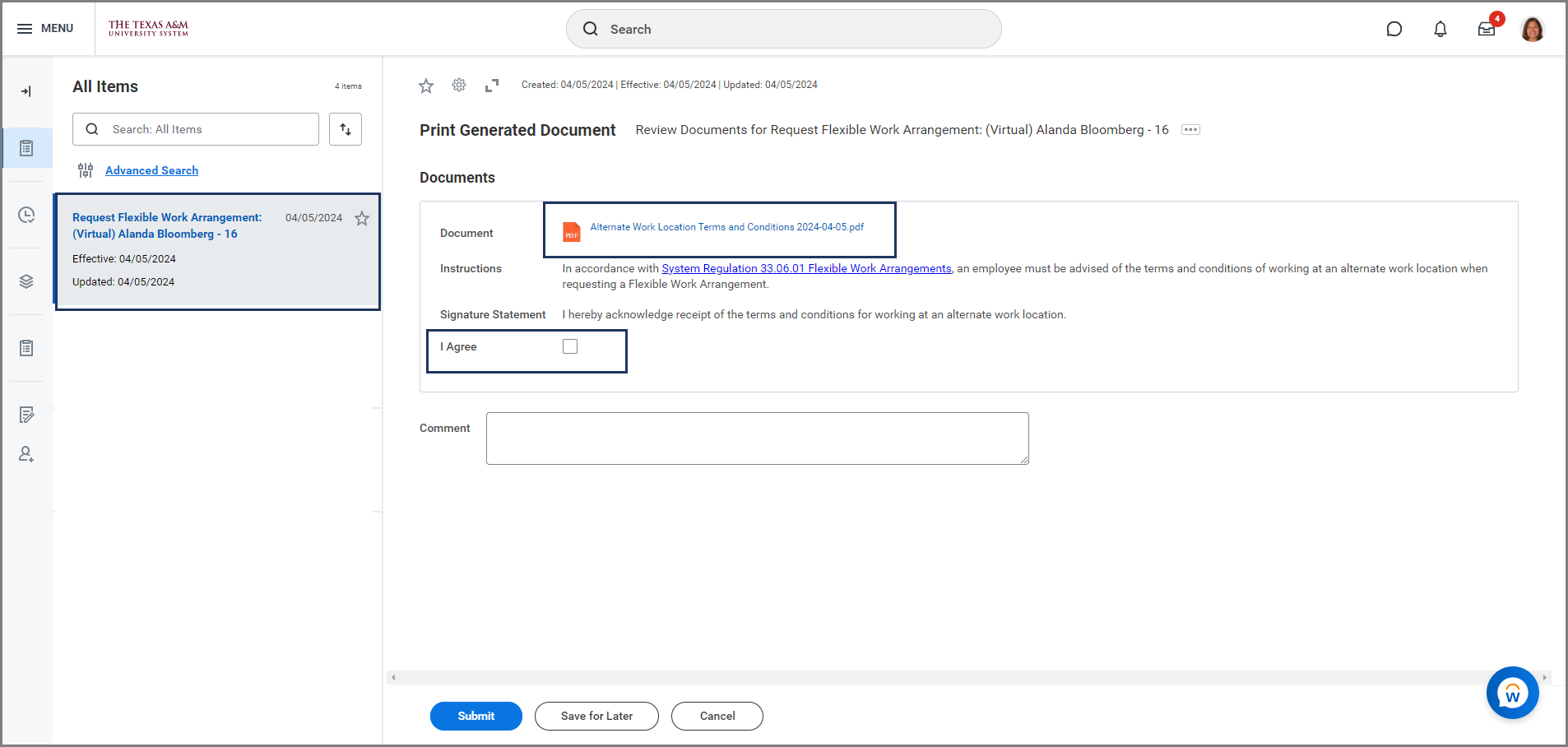 You will receive the To Do: Request Flexible Work Arrangement. This task will require you to review the document Alternate Work Location Terms and Conditions.
