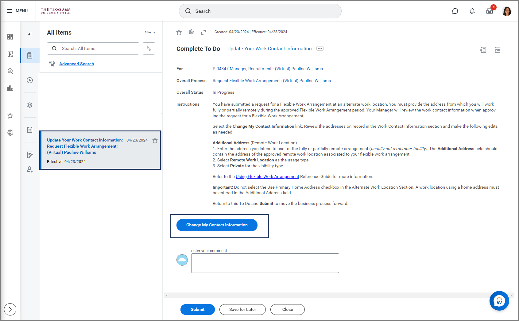 - Select the blue Change My Contact Information button. The button will take you to a page to update your contact information, but you must return to your inbox to submit the To Do after you have completed the Change My Contact Information task. Do not initiate a stand-alone Change My Contact Information task.